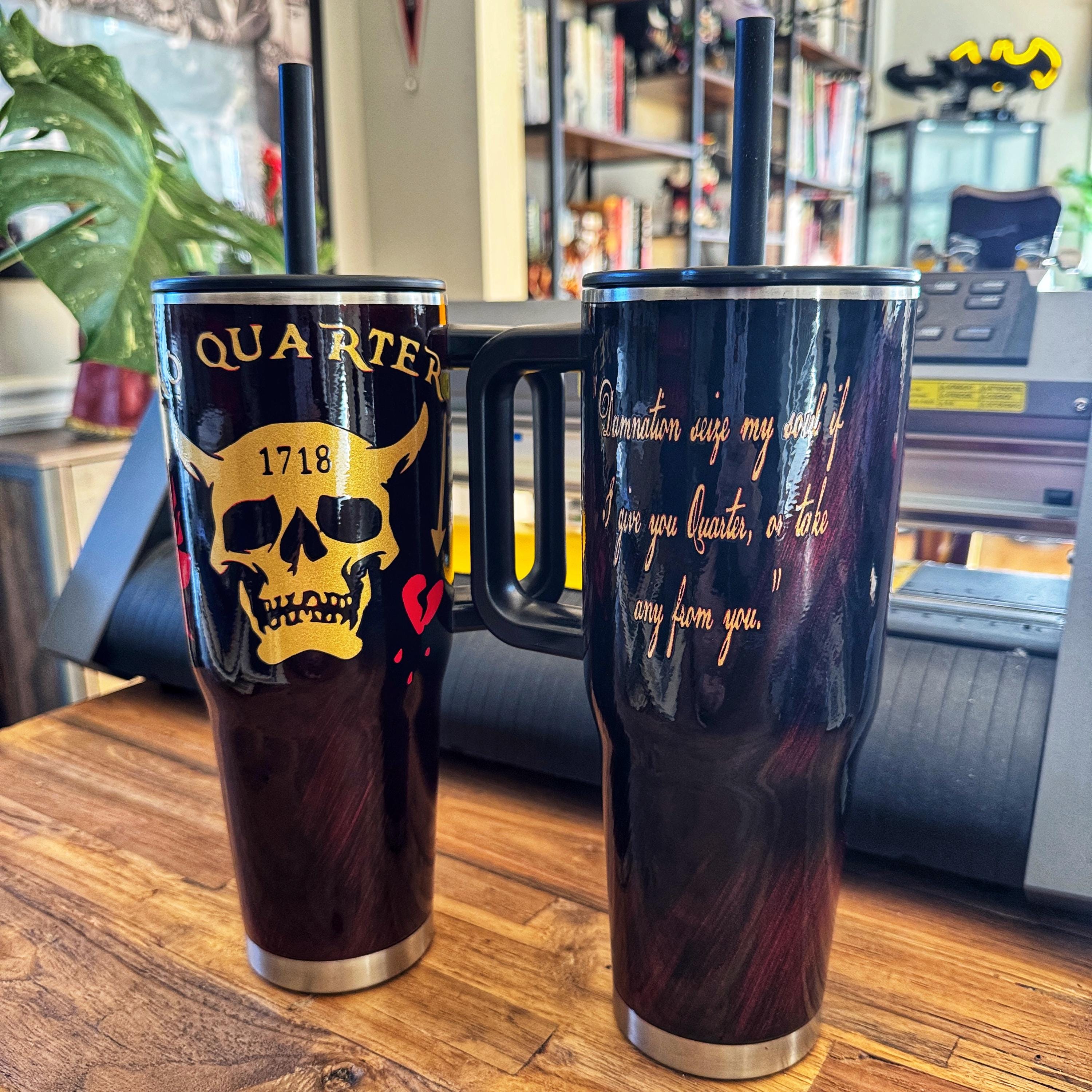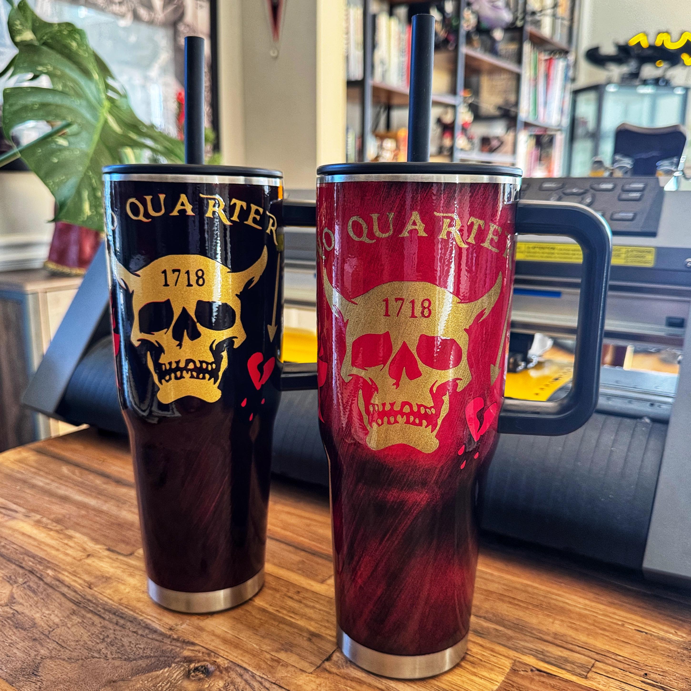 1. One tumbler has the No Quarter with skull on one side and is darker overall with almost all black cup color.